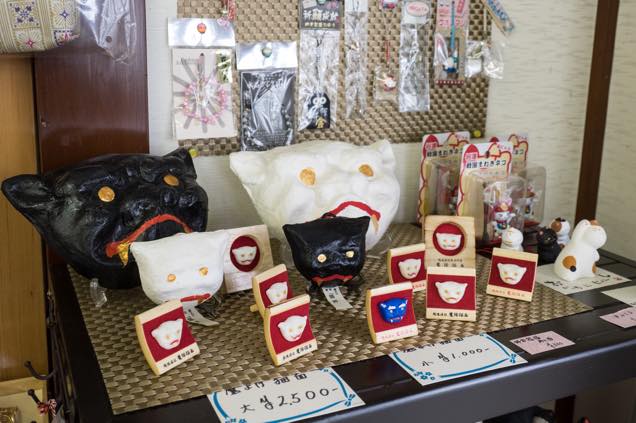 お邪魔すると、雑貨や浦佐のお土産品、和ろうそくに混じって、猫瓦グッズや猫面グッズが並んでいるではないか。
